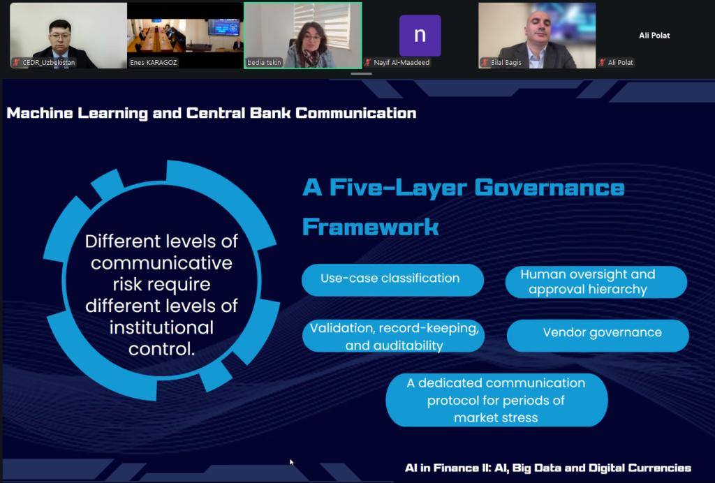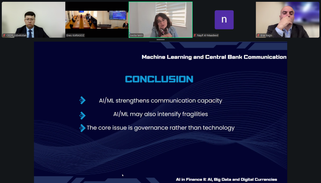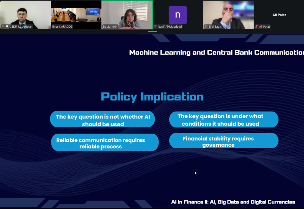 Seminar davomida Turkiyaning yetakchi moliyaviy nashrlari ishtirokidagi maxsus media-panel tashkil etildi. Ilmiy ma’ruzalar quyidagi yo’nalishlarni qamrab oldi: auditda sun’iy intellekt va avtonom agentlarga o’tish jarayoni; markaziy bank kommunikatsiyasi va moliyaviy barqarorlikni AI yordamida muvofiqlashtirish; yangi avlod to’lov protokollari arxitekturasi; islom moliyasida AI; ESG investitsiyalari va yashil energetika moliyasini agent asosidagi modellashtirish.
